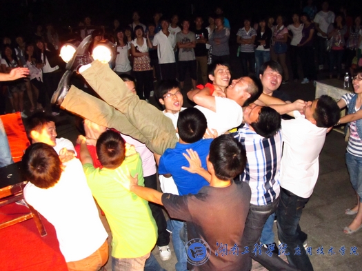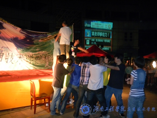 音乐,灯光,呐喊,三者齐聚,狂欢开始。KISS FLOOR舞团劲爆的街舞表演立马引爆全场,让大家High到了最高点。酷炫的街舞表演过后,主持人简单地介绍了团总支学生会各部门的职能与所起到的作用,并向在场的各位观众表示感谢。接着,“狂欢夜”进入到了游戏环节,“信任背摔”游戏由“大脚步户外拓展”俱乐部所提供,该游戏是一项培养团队间互相信任的游戏,通过游戏能让同伴间从一般了解到相互信任。游戏开始,缪老师和章老师经不住盛情相邀参与到了其中,和同学们一起游戏。活动过后,章老师笑着对记者说:“在通过沟通并产生信任的过程中,信任背摔起到了很好的载体和桥梁的作用。我相信同学们!”狂欢夜活动内容十分丰富,有创新的游戏,有现场微博抽奖项目,更有2011年校园歌手大赛亚军邓淑君同学带来的动听歌声。整场活动在同学们的热情参与下,活力四射,笑声连连。