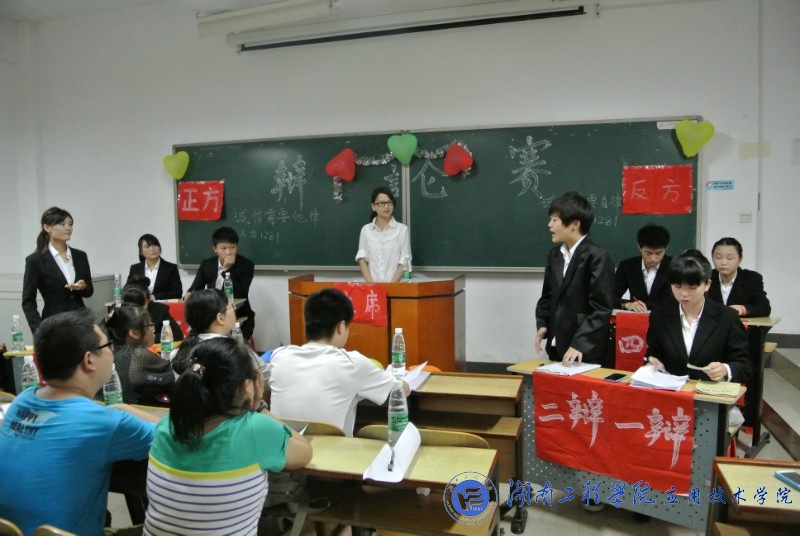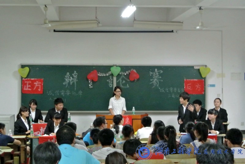 比赛辩题是“诚信需要他律还是自律”。在正反双方慷慨激昂的自我介绍后,双方一辩用高度概括的陈述为辩论开篇立论。然后,双方二三辩彼此反驳,思维灵活,逻辑缜密,不时赢得场下阵阵掌声。在自由辩论环节,正方以荀子的诚信故事与监考老师、保安的典型事例进行正反对比,论证强有力的阐述了己方诚信的保障是他律。辩手们精辟的措辞,犀利的语言,展现出咄咄逼人的气势。反方辩手也毫不示弱,他们通过“上有政策,下有对策”以及国家领导的诚信自律等从多角度论证了己方的观点。顿时将全场紧张氛围推向高潮,更是赢得在场观众掌声和叫好声不断。进入总结陈词环节,双方四辩各自针对对手逻辑上的漏洞层层剖析,逐一进行回击。短暂而精彩的观众提问环节后,面对评委的提问,正反双方辩手清晰地思路和巧妙的陈词给评委留下了深刻印象。