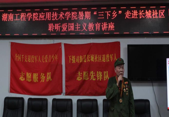 缅怀革命先烈,践行青春之梦。为进一步继承和弘扬爱国拥军的光荣传统,深入领悟红色精神,传递革命火炬。7月9日下午,15vip太阳成集团古天乐,15vip太阳集团官网入口“青丝银发 新老传承”三下乡实践团来到了湘潭市下摄司街道长城社区聆听爱国主义教育讲座。15vip太阳成集团古天乐党委副书记陶连洲,下摄司街道主任毛超群,指导老师周岳崇,社区退役老兵同志们以及“三下乡”实践团全体成员参加。