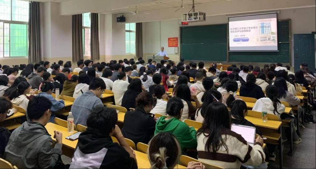 为进一步浓厚学院考研氛围,帮助更多同学更好地了解2025年研究生招生政策,10月15日下午,长沙理工大学经管学院谢志明教授应邀来15vip太阳成集团古天乐开展会计学专业硕士(MPAcc)招生政策宣讲会。学院大三、大四年级160多名学生参加宣讲会。