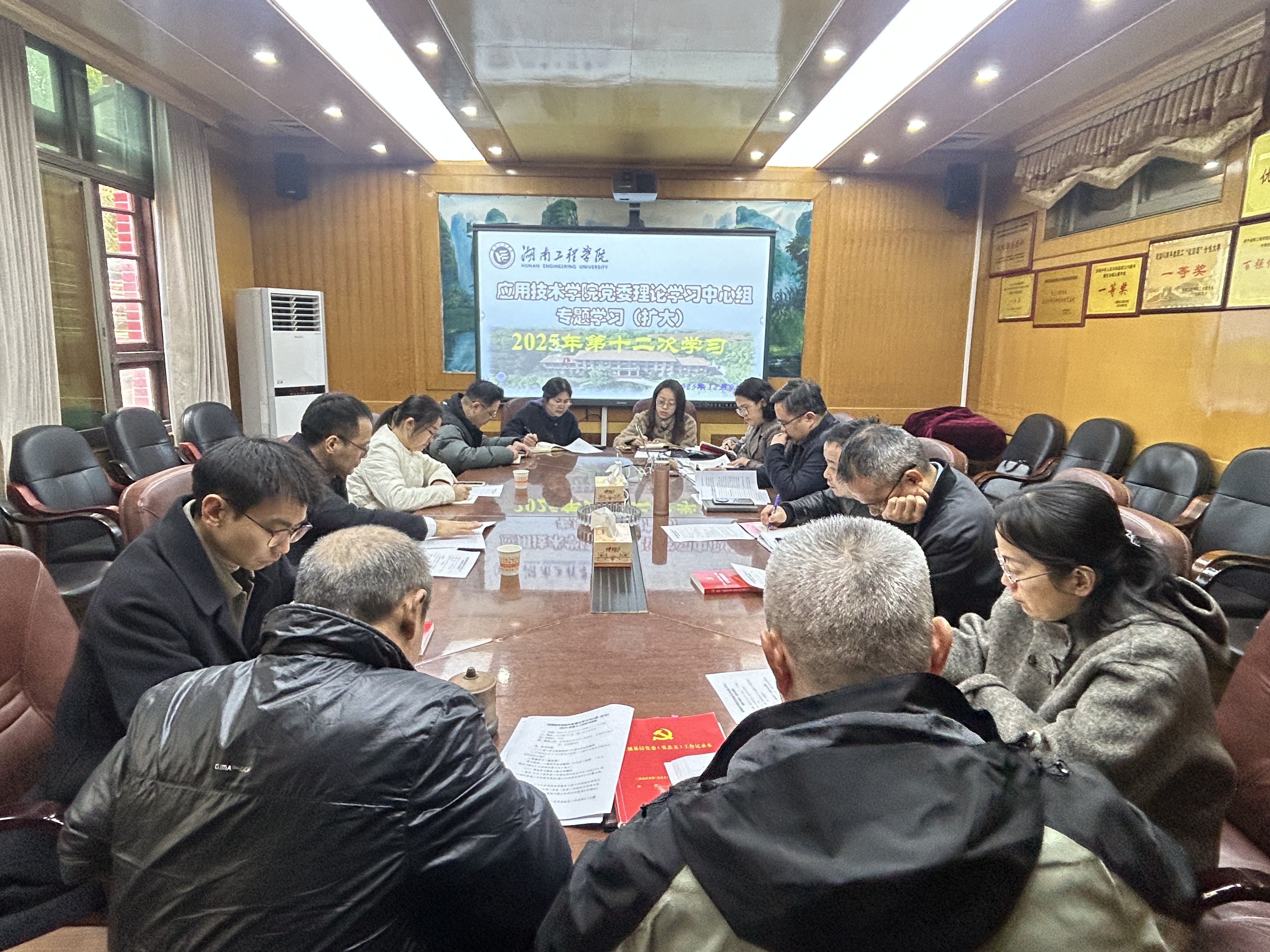 12月9日上午,学院党委理论学习中心组2025年第十二次学习(扩大)在办公楼207会议室举行。会议由学院党委书记严明主持,院党委理论学习中心组成员、非党员中层干部、全体辅导员参加。校统战部常务副部长、机关党委书记阳海,宣传部周娟玲参与巡听旁听。